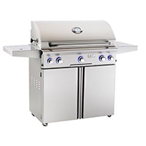 The new “L” series grills feature an electronic push button ignition system that does not require batteries. It also includes interior halogen lights (controlled by a push button located on the right side of the unit) ideal for evening grilling. Requires 120 Volt AC power.
