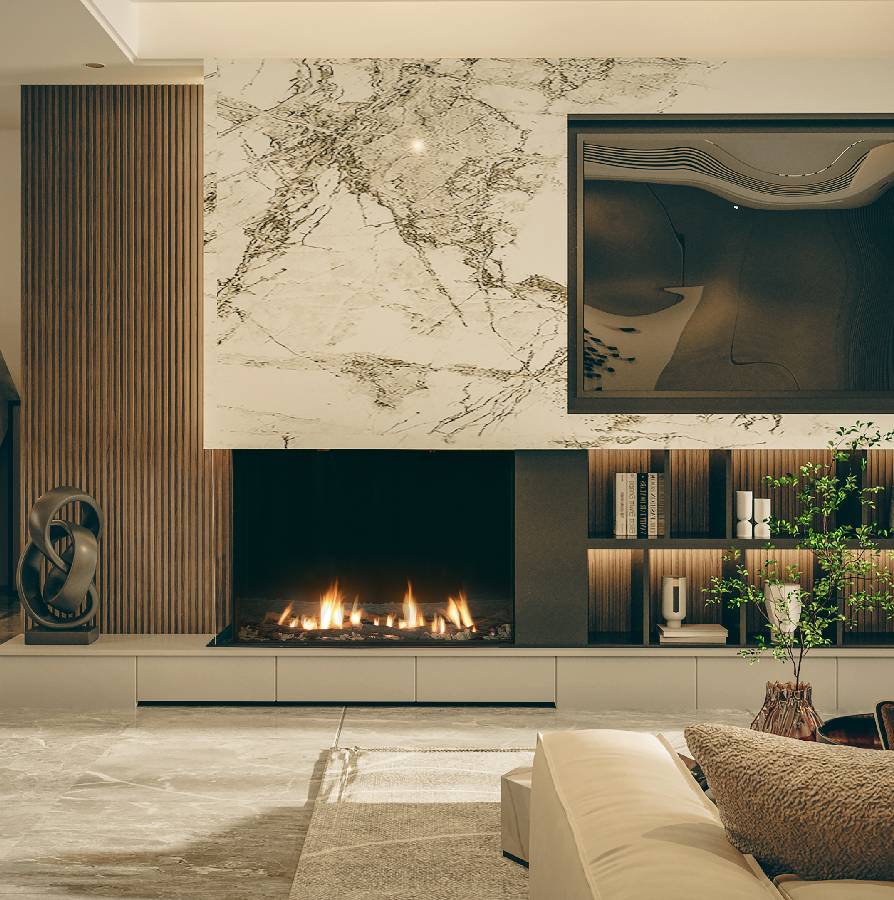 The extra-tall version of the 44-inch corner with the HH profile's maximum glass height. The tallest corner-wrapped flame in the 44" width class. Available in left-side or right-side configuration.