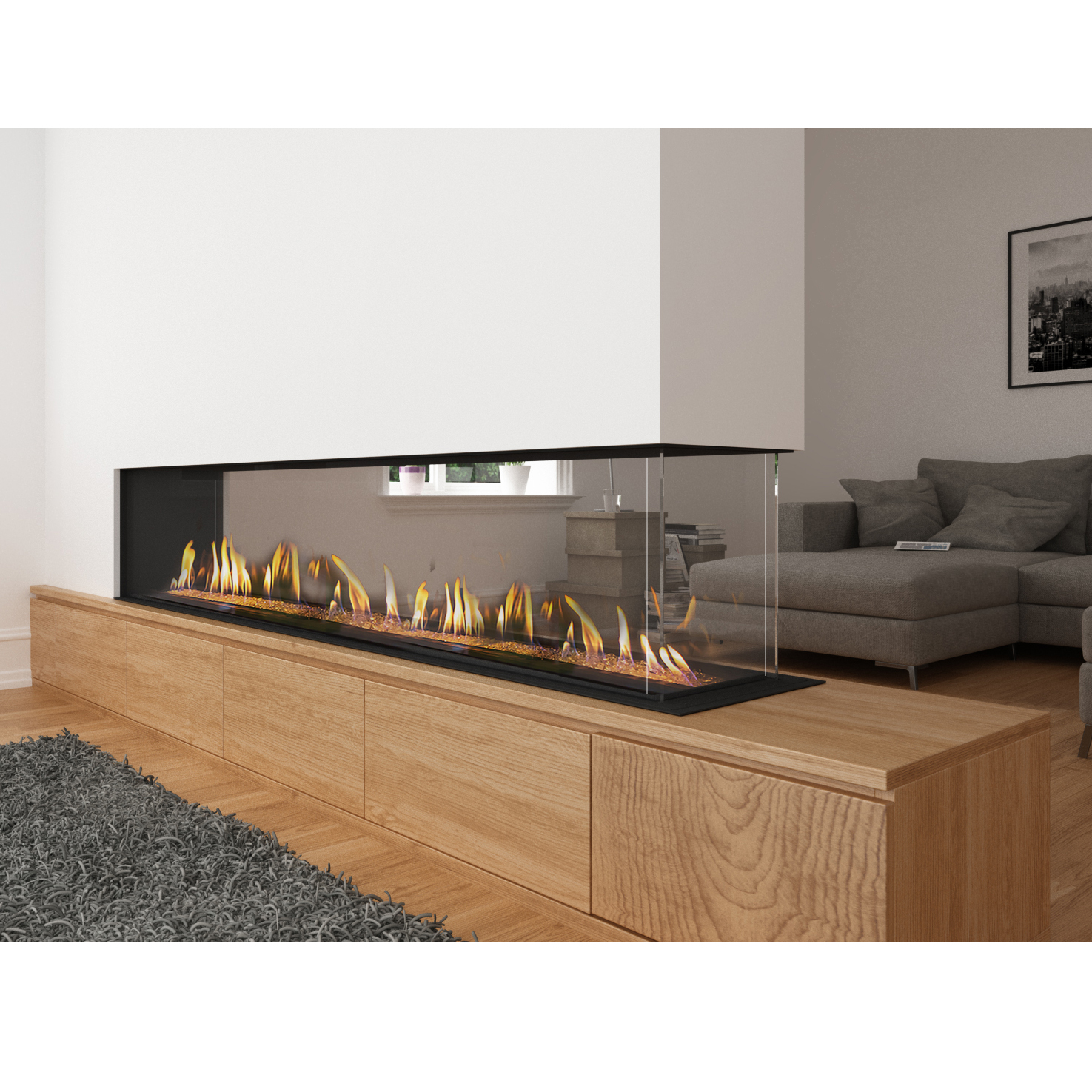 The largest Space Creator — a massive room divider with over seven feet of flame. The SC 200 is the ultimate open-plan architectural fireplace, creating a grand statement while preserving visual flow between spaces. Over 51,000 BTU output.