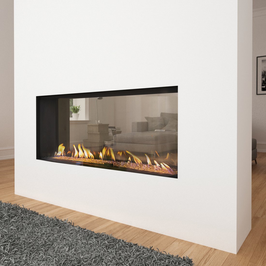 The tall version of the 51-inch tunnel with a 50⁵⁄₁₆" x 21⅝" viewing area. 317 lbs (double glass). The H profile delivers enhanced see-through flame visibility for a striking dual-space room divider.