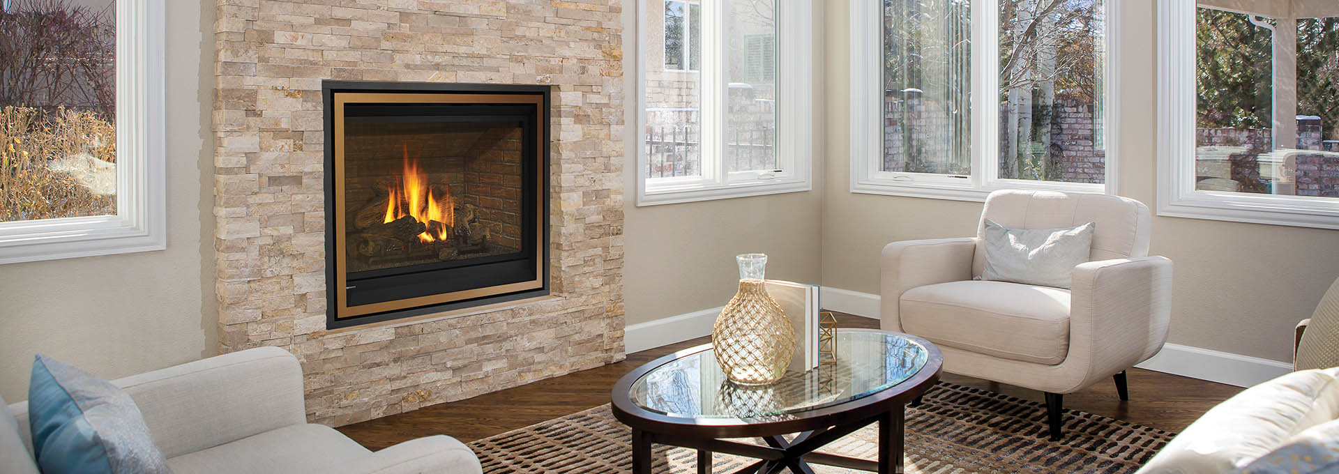Large 41" traditional gas fireplace with Electronic Ignition. Expansive viewing area with premium log package and bold flames framed with vignette or flush panels.
