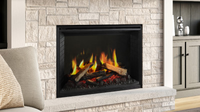 36" portrait/square electric fireplace featuring advanced LCD flame display technology with ultra-realistic firebed and assortment of dynamic fuel effects. Available as fireplace or insert.